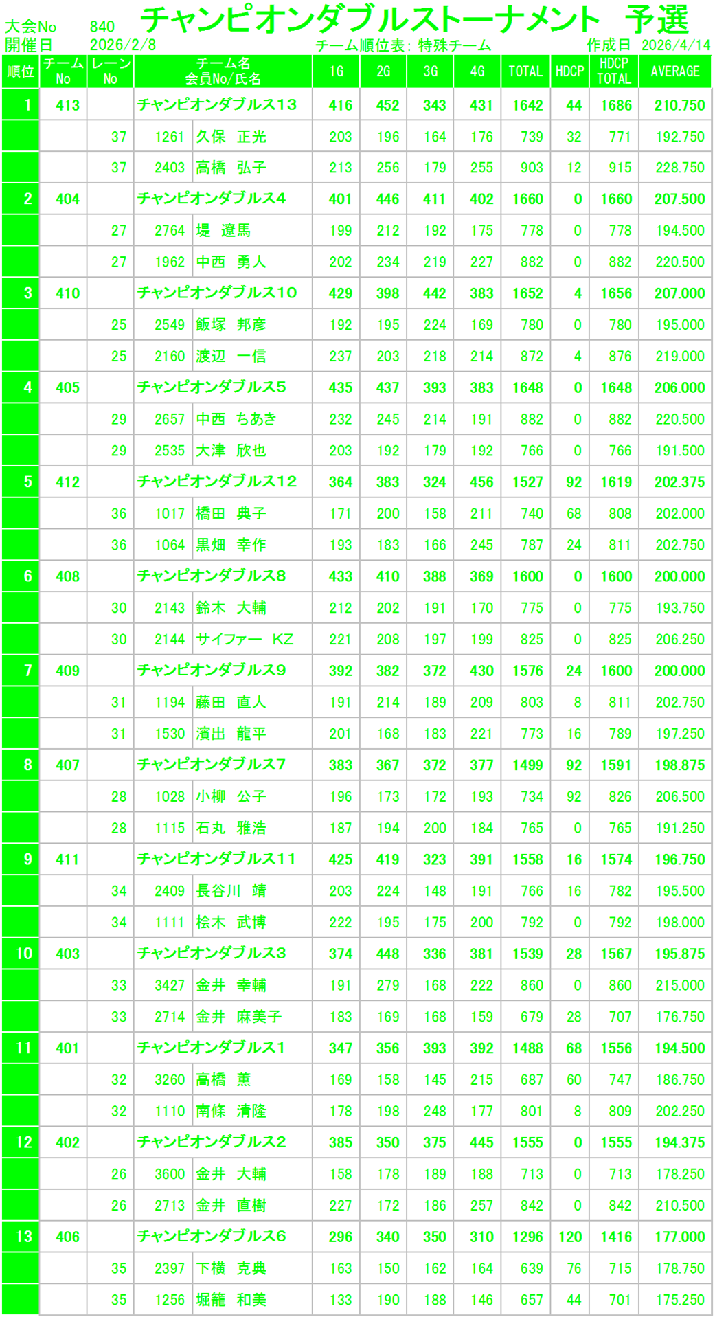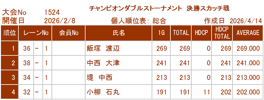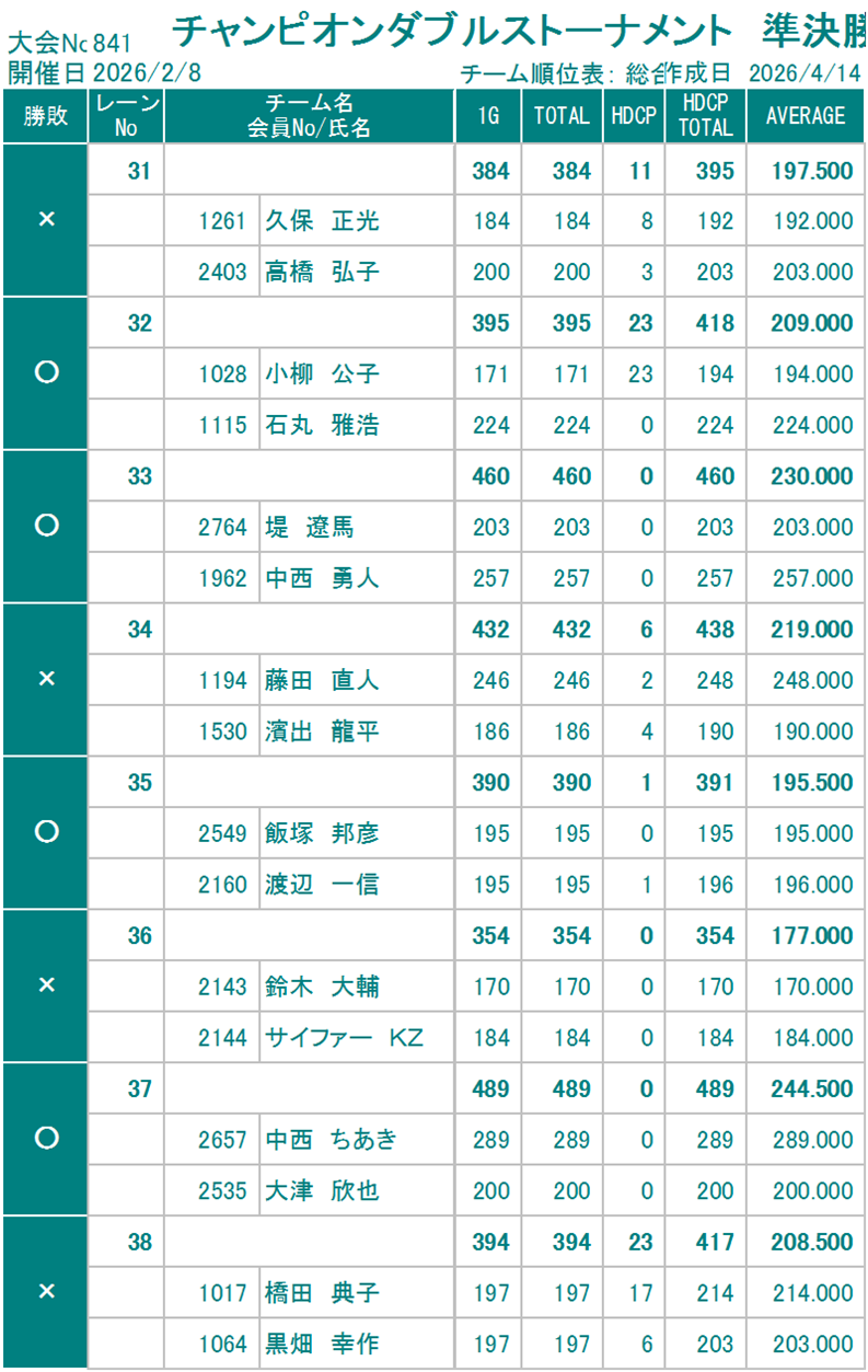 優    勝 下横・堀籠チーム 1722P