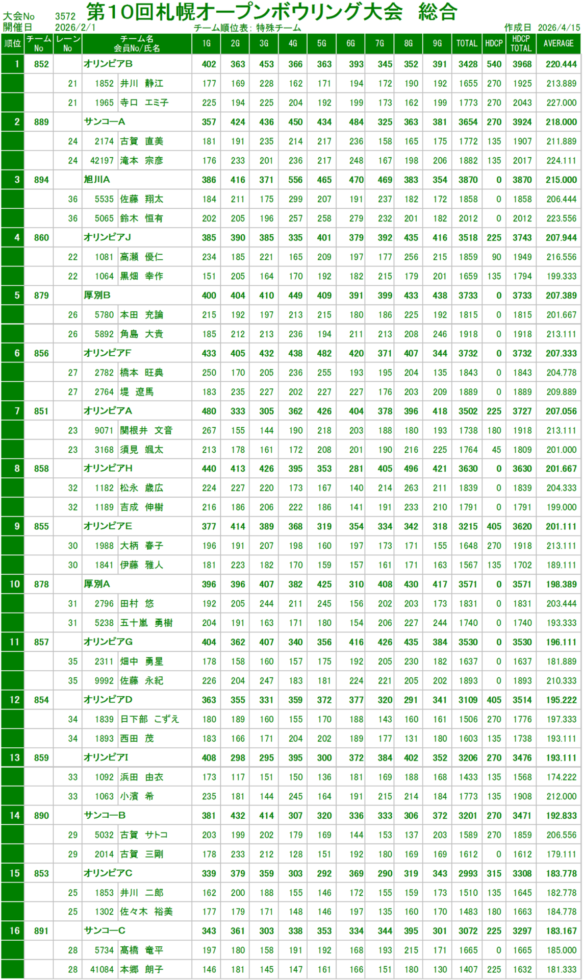 | 優 勝 | 井川・寺口チーム | 3968P |